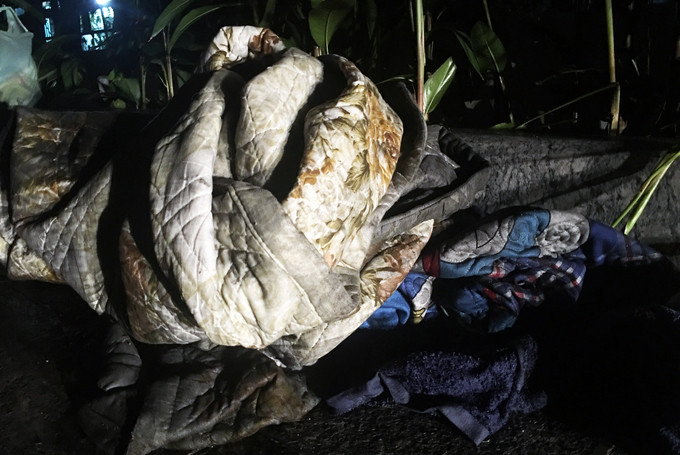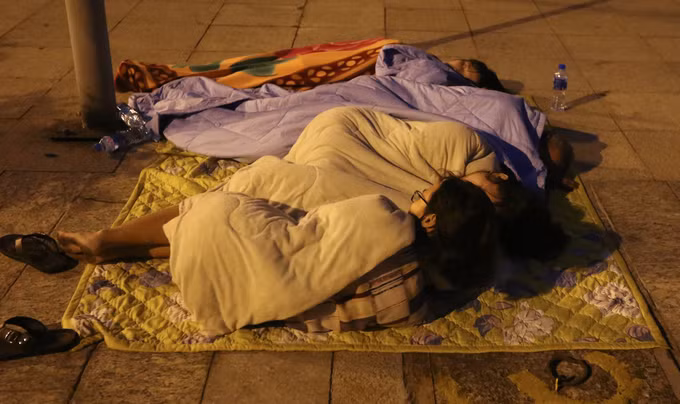3h, một gia đình mang chăn chiếu ngủ ở khuôn viên khu chung cư.