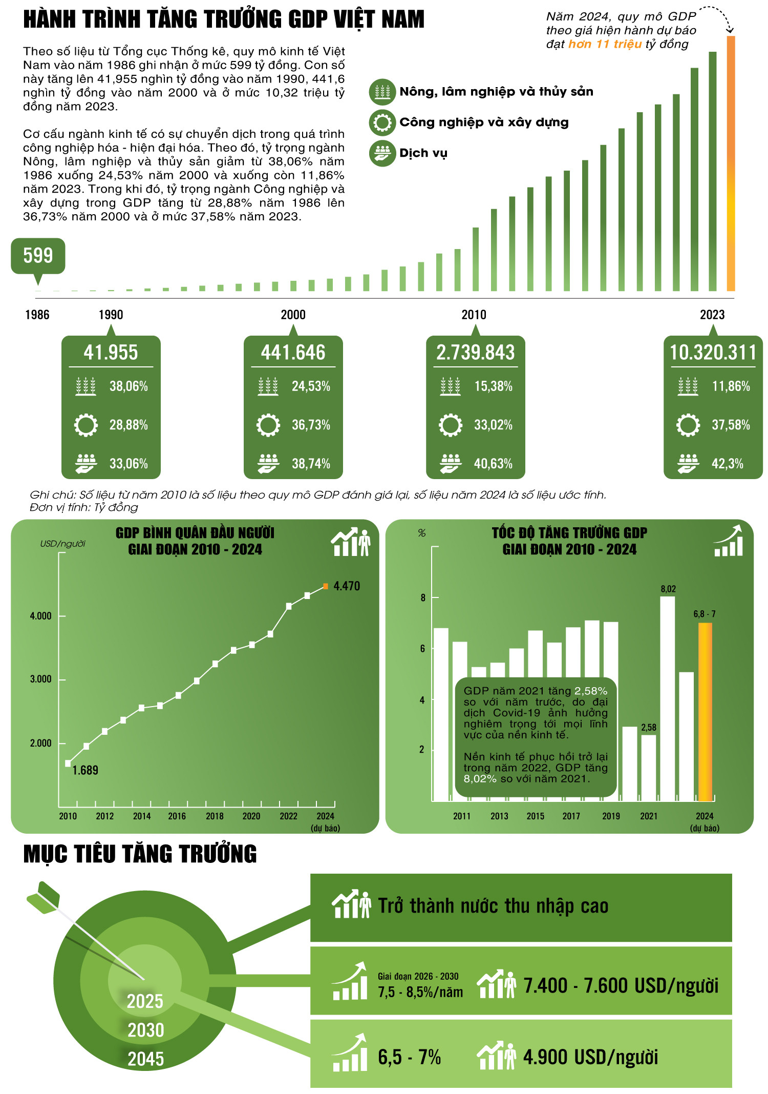 (BĐT) - Quy mô nền kinh tế Việt Nam năm 1986 ghi nhận ở mức 599 tỷ đồng. Con số này tăng lên 41,955 nghìn tỷ đồng vào năm 1990, 441,6 nghìn tỷ đồng vào năm 2000 và ở mức 10,32 triệu tỷ đồng năm 2023...