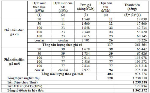 Ứng với từng bậc thang và đơn giá điện cũ, số tiền điện phải trả của 7 ngày giá điện cũ là 261.564 đồng. Với định mức cho đơn giá mới, số tiền khách hàng phải trả là 976.774 đồng. Tổng cộng số tiền điện phải trả tháng 4 là 1.238.338 đồng (chưa gồm thuế VAT 10%). Và số tiền điện sau thuế là 1.362.172 đồng.