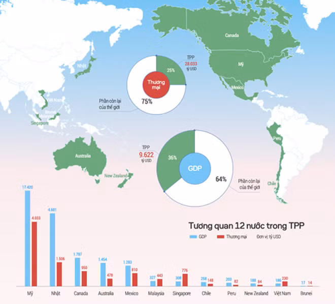 TPP gồm các quốc gia New Zealand, Australia, Canada, Mỹ, Mexico, Nhật Bản, Malaysia, Brunei, Việt Nam, Singapore, Peru và Chile. TPP được đàm phán từ tháng 3/2010, gồm 12 quốc gia - Australia, Brunei, Canada, Chile, Nhật Bản, Malaysia, Mexico, New Zealand, Peru, Singapore, Mỹ và Việt Nam. Việc đàm phán hoàn tất vào tháng 10 năm ngoái và đến tháng 11, toàn văn hiệp định cũng đã được công bố.