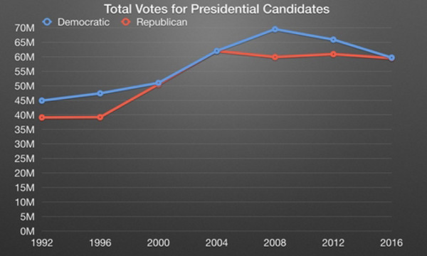 Theo số liệu về số cử tri đi bầu cho mỗi đảng từ năm 1992, số người ủng hộ cho đảng Dân chủ giảm từ khi ông Obama chiến thắng năm 2008, trong khi số người ủng hộ đảng Cộng hòa ít thay đổi từ năm 2004.