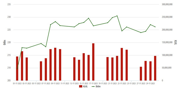 Giao dịch của nhóm cổ phiếu HNX30 tháng 11/2023 có tổng khối lượng giao dịch đạt hơn 1.820 triệu cổ phiếu, tương ứng giá trị giao dịch đạt hơn 38,5 nghìn tỷ đồng, chiếm tỷ trọng 77,41% khối lượng giao dịch và 86,81% giá trị giao dịch toàn thị trường.