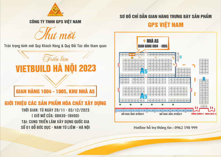 Triển lãm quốc tế Vietbuild Hà Nội 2023 với chủ đề ‘Bất động sản - Trang trí nội ngoại thất - Xây dựng - Vật liệu xây dựng’, quy tụ gần 1000 gian hàng sản phẩm mới, công nghệ tiên tiến từ nhiều quốc gia tham dự. Gian hàng của GPS Việt Nam có vị trí tại khu nhà A5, gian số 1004 - 1005 (đi từ cổng chính của mặt đường Đỗ Đức Dục, phía bên trái), mở cửa từ 8h30 - 18h00 từ ngày 29/11 đến hết ngày 3/12/2023.