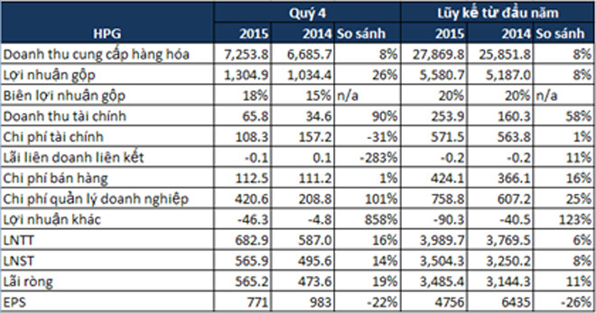 Biên lợi nhuận gộp trong kỳ của Hòa Phát đạt mức 18% trong quý 4 và 20% cả năm 2015, tăng nhẹ so với cùng kỳ 2014.