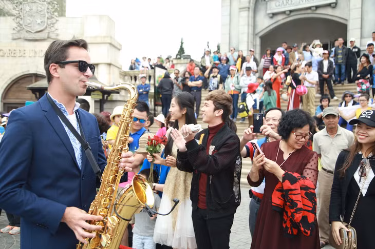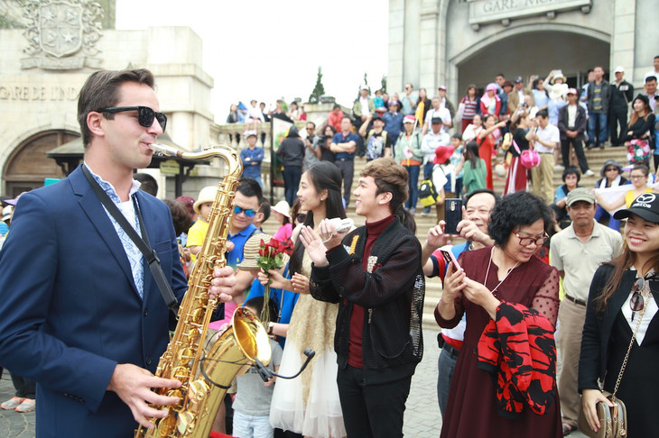 Nhiều cặp đôi du khách cũng được chào đón để góp vui vào bữa tiệc Carnival sôi động. Trong khoảnh khắc mọi người cùng hoà chung điệu nhạc, bước chân rộn ràng như những vũ công đích thực, chúng tôi bắt gặp ca sĩ Minh "xù" đang vui hết mình cùng cô bạn xinh xắn đi cùng.