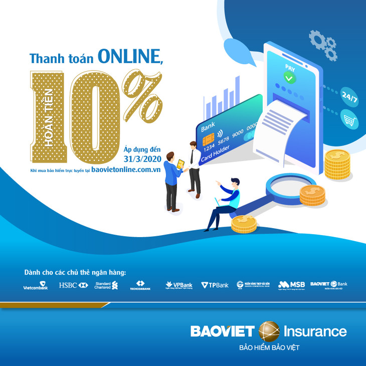 (BĐT) - Nhanh, tiện lợi, không tốn nhiều thời gian, công sức, dễ dàng chọn lựa chỉ bằng một vài thao tác đơn giản, mua sắm online đang trở thành xu thế và sự lựa chọn của số đông khách hàng hiện nay. Đáp ứng nhu cầu đó, cũng như tối ưu quyền lợi khách hàng, từ ngày 22/4/2019, Bảo hiểm Bảo Việt tiếp tục triển khai chương trình “Thanh toán online, nhận ngay ưu đãi” – hoàn tiền 10% vào thẻ thanh toán khi mua các sản phẩm bảo hiểm tại baovietonline.com.vn.