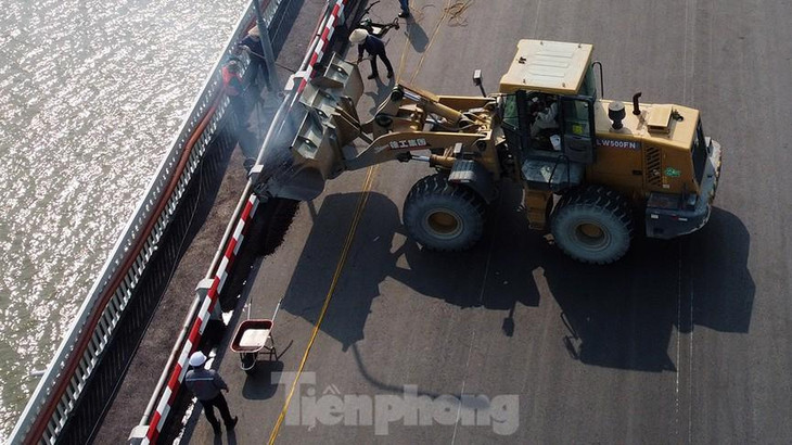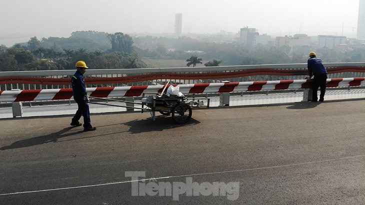 | 100 khối lượng công việc tu sửa mạt cầu đã xong, giờ chỉ còn lại việc kẻ sơn phân làn đường. |