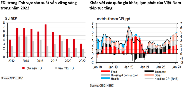 Mặc dù vậy, theo HSBC, Việt Nam khởi đầu năm 2023 với dòng vốn FDI mới khả quan (1,2 tỷ USD). Bất chấp chu kỳ đi xuống của công nghệ toàn cầu trong ngắn hạn, các công ty công nghệ tiếp tục đầu tư vào Việt Nam. Thực tế, dù tổng FDI sụt giảm trong năm 2022, FDI trong lĩnh vực sản xuất vẫn vững vàng, càng nêu bật lợi thế cạnh tranh của Việt Nam trong mảng này.