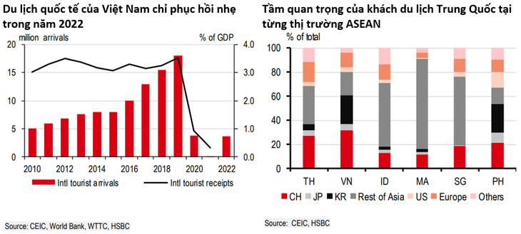 Theo HSBC, sau khi mở cửa trở lại vào tháng 3 năm ngoái, du lịch nội địa đã phục hồi mạnh mẽ, giúp Việt Nam dễ dàng vượt qua mục tiêu 60 triệu lượt khách nội địa trong năm 2022 và thực tế đạt được trên 100 triệu lượt khách du lịch nội địa. Đồng thời, Việt Nam đón 3,6 triệu lượt khách du lịch quốc tế, chủ yếu là du khách đến từ Hàn Quốc (26%) và Mỹ (9%).