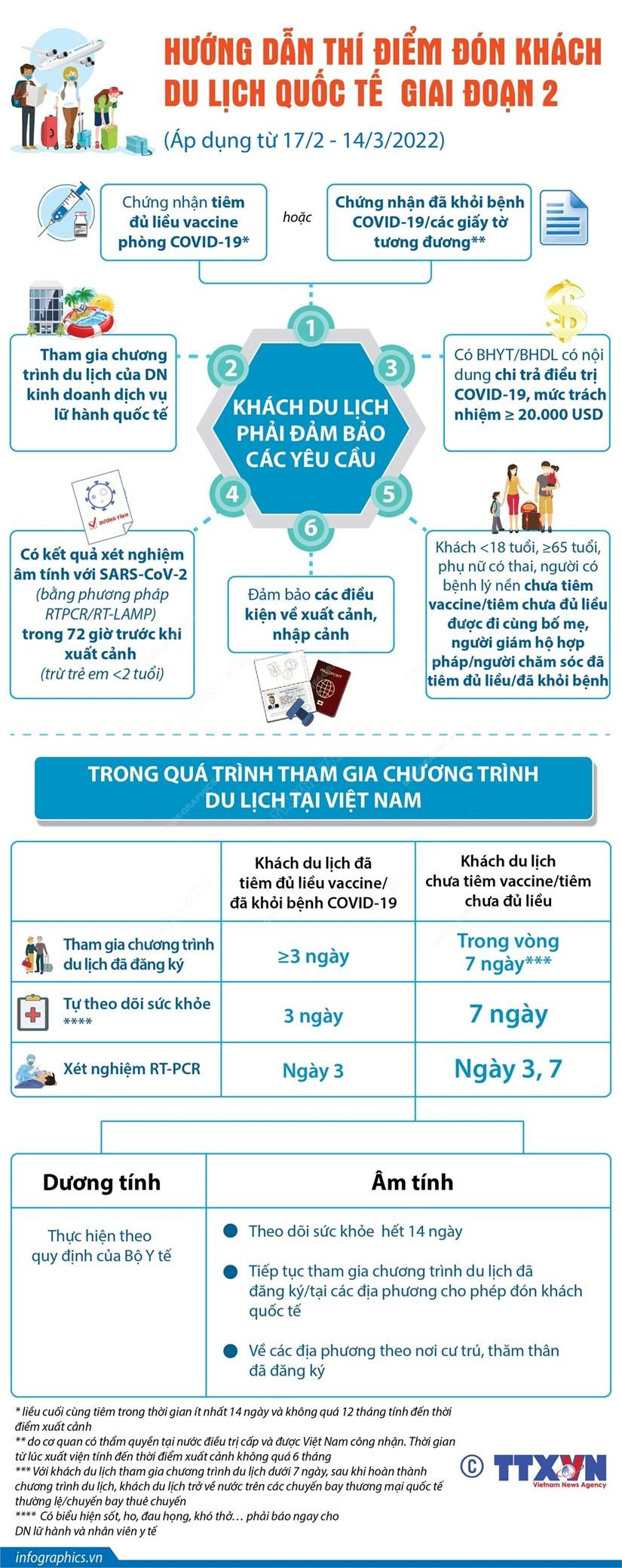 Ngày 17/2, Bộ Văn hóa, Thể thao và Du lịch ban hành văn bản số 465/BVHTTDL-TCDL về việc Hướng dẫn thí điểm đón khách du lịch quốc tế trong giai đoạn 2 đến ngày 14/3/2022.