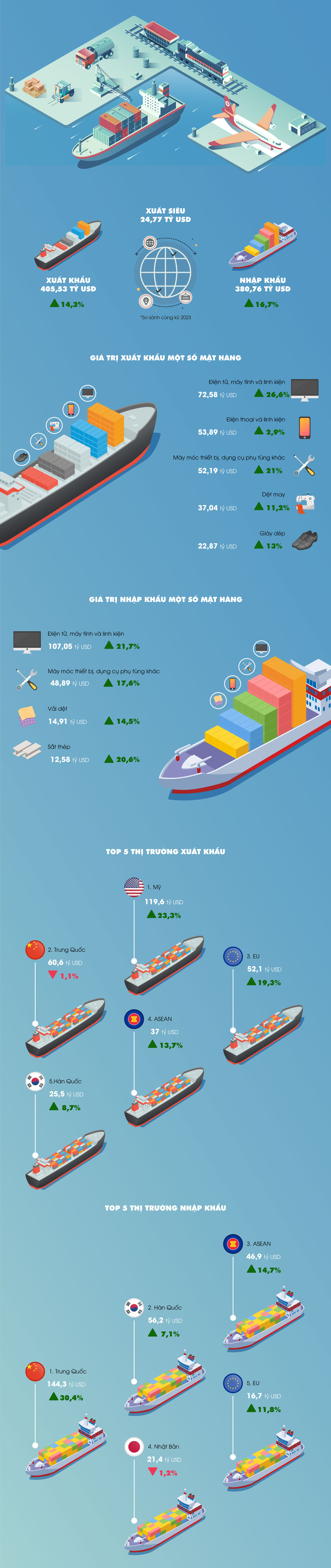 Về thị trường xuất, nhập khẩu hàng hóa năm 2024, Mỹ là thị trường xuất khẩu lớn nhất của Việt Nam với kim ngạch đạt 119,6 tỷ USD. Trung Quốc là thị trường nhập khẩu lớn nhất của Việt Nam với kim ngạch đạt 144,3 tỷ USD. Trong năm 2024, xuất siêu sang Mỹ đạt 104,6 tỷ USD tăng 25,6% so với năm trước; xuất siêu sang EU 35,4 tỷ USD, tăng 23,2%; xuất siêu sang Nhật Bản 3,2 tỷ USD, tăng 91,9%; nhập siêu từ Trung Quốc 83,7 tỷ USD, tăng 69,5%; nhập siêu từ Hàn Quốc 30,7 tỷ USD, tăng 5,9%; nhập siêu từ ASEAN 9,9 tỷ USD, tăng 18,9%.