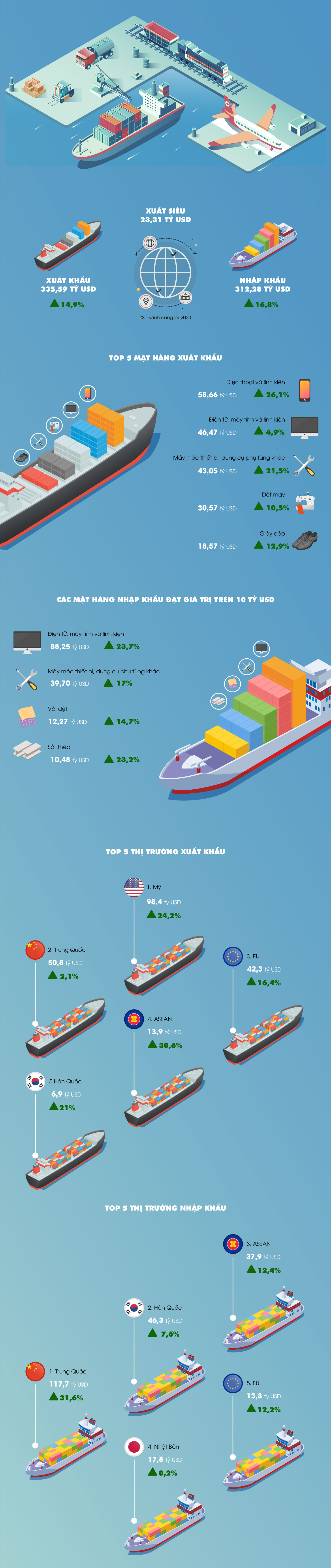 Về thị trường xuất, nhập khẩu hàng hóa 10 tháng năm 2024, Mỹ là thị trường xuất khẩu lớn nhất của Việt Nam với kim ngạch đạt 98,4 tỷ USD. Trung Quốc là thị trường nhập khẩu lớn nhất của Việt Nam với kim ngạch đạt 117,7 tỷ USD. Trong mười tháng năm 2024, xuất siêu sang Mỹ đạt 86,1 tỷ USD tăng 26,9% so với cùng kỳ năm trước; xuất siêu sang EU 28,5 tỷ USD, tăng 18,6%; xuất siêu sang Nhật Bản 2,4 tỷ USD, tăng 56,9%; nhập siêu từ Trung Quốc 66,9 tỷ USD, tăng 68,5%; nhập siêu từ Hàn Quốc 25,3 tỷ USD, tăng 8,1%; nhập siêu từ ASEAN 7,3 tỷ USD, tăng 6,4%.
