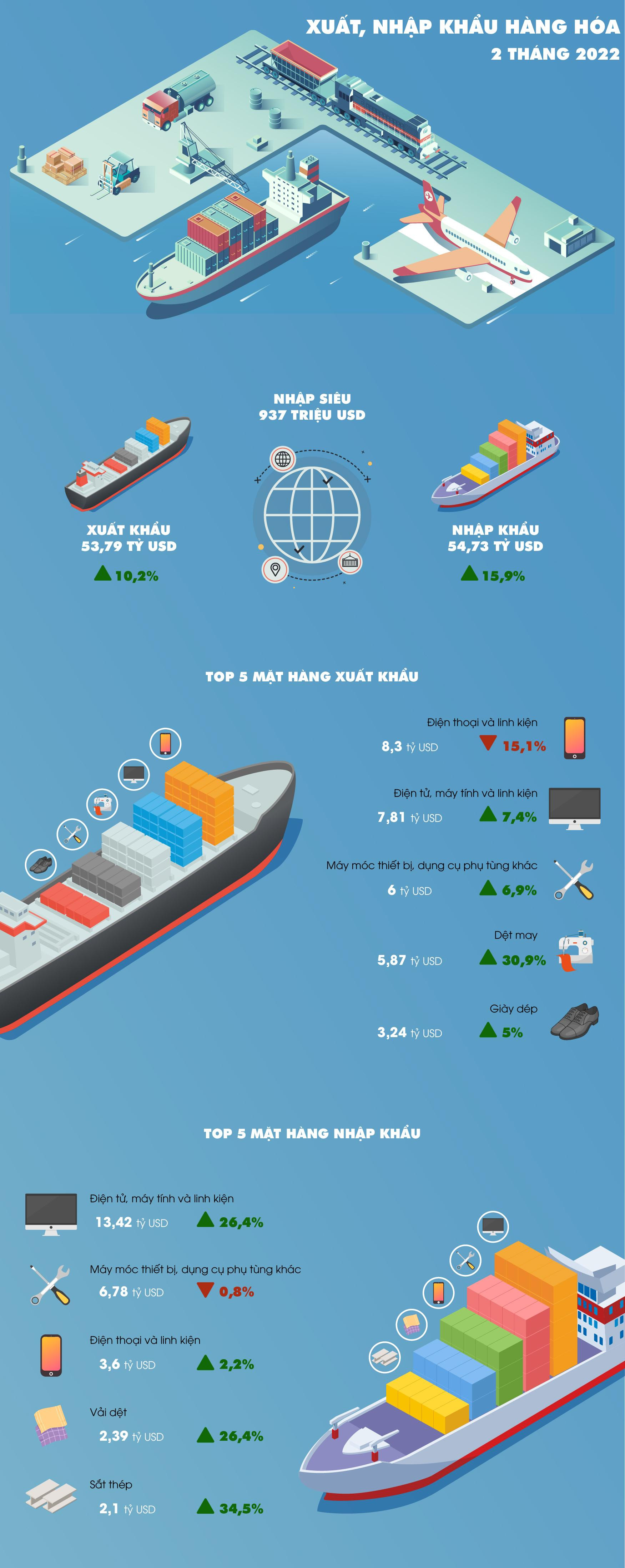 Ở chiều ngược lại, kim ngạch nhập khẩu hàng hóa 2 tháng đầu năm 2022 ước đạt 54,73 tỷ USD, tăng 15,9% so với cùng kỳ năm trước. Trong đó, khu vực kinh tế trong nước đạt 18,25 tỷ USD, tăng 16,9%; khu vực có vốn đầu tư nước ngoài đạt 36,48 tỷ USD, tăng 15,4%. Trong 2 tháng đầu năm 2022 có 13 mặt hàng nhập khẩu đạt trị giá trên 1 tỷ USD, chiếm tỷ trọng 71,6% tổng kim ngạch nhập khẩu.