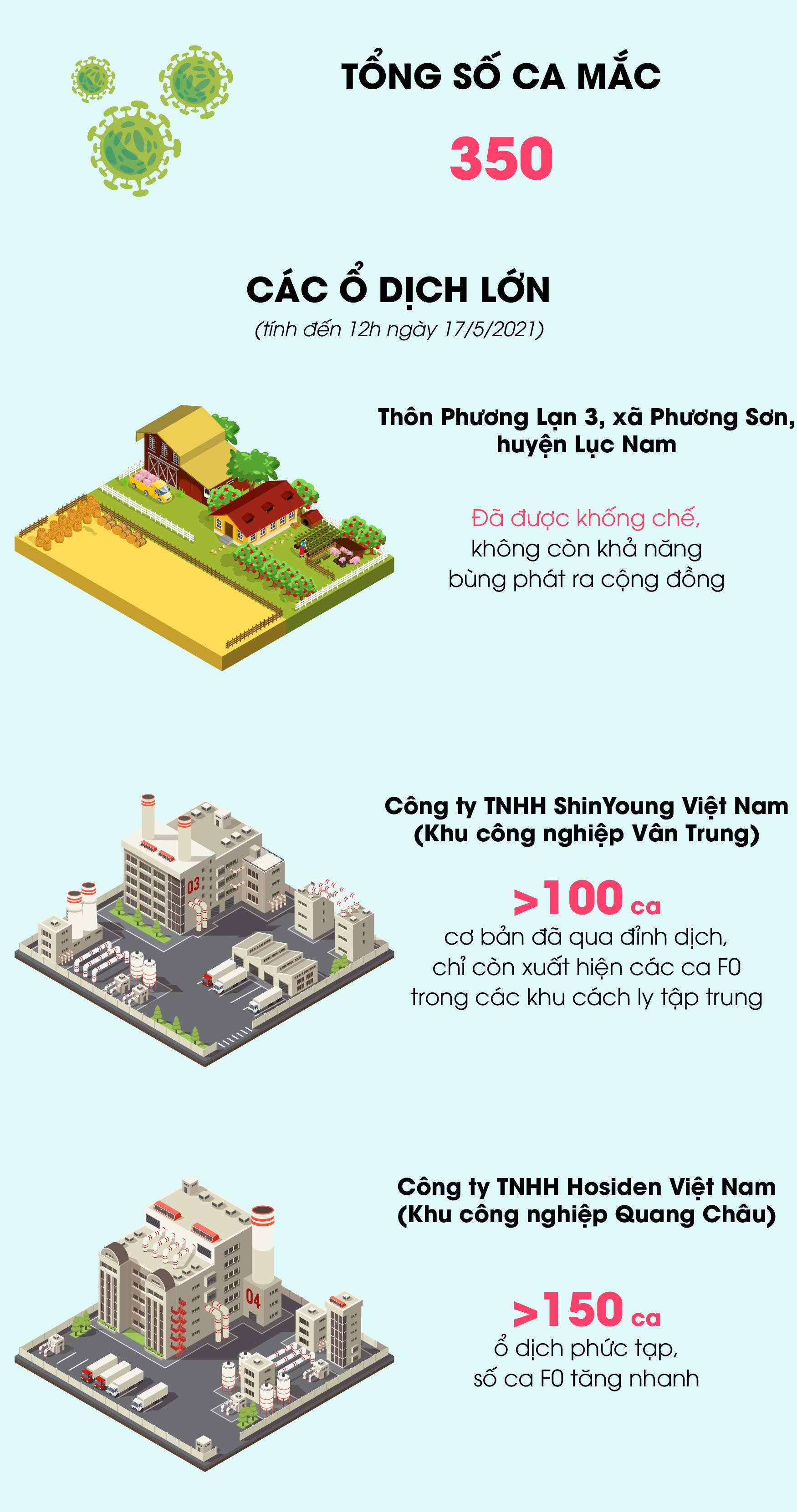 (BĐT) - Theo số liệu thống kê của Bộ Y tế, tính đến 12 giờ ngày 17/5, toàn tỉnh Bắc Giang có thêm 14 ca mắc mới, nâng tổng số ca mắc toàn Tỉnh lên 350 ca. Hiện 2 ổ dịch ở Khu công nghiệp Vân Trung và Khu công nghiệp Quang Châu vẫn đang diễn biến rất phức tạp.