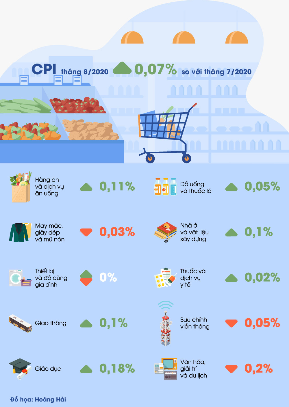 Chỉ số giá tiêu dùng tháng 8/2020 tăng so với tháng trước đó chủ yếu do ảnh hưởng của cơn bão số 2 và mưa trên diện rộng làm giá rau tăng; giá gạo trong nước tăng do giá gạo xuất khẩu của Việt Nam thuận lợi đạt ở mức cao trong nhiều năm trở lại đây; giá dịch vụ giáo dục được điều chỉnh tăng ở một số tỉnh, thành phố trực thuộc Trung ương theo Nghị định 86/2015/NĐ-CP ngày 02/10/2015 của Chính phủ. Chỉ số giá tiêu dùng bình quân 8 tháng năm 2020 tăng 3,96% so với cùng kỳ năm trước.