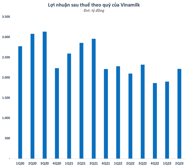 Công ty CP Sữa Việt Nam (Vinamilk - mã: VNM) vừa công bố sơ bộ kết quả kinh doanh quý II/2023 với tổng doanh thu hợp nhất ước đạt 15.200 tỷ đồng, tăng 1,6% so với cùng kỳ và tăng 8,9% so với quý trước. Lợi nhuận sau thuế ước đạt 2.220 tỷ đồng, tăng 5,6% so với cùng kỳ và tăng 16,5% so với quý I/2023. Đây là quý đầu tiên ghi nhận lợi nhuận tăng trưởng dương kể từ đầu năm 2021.