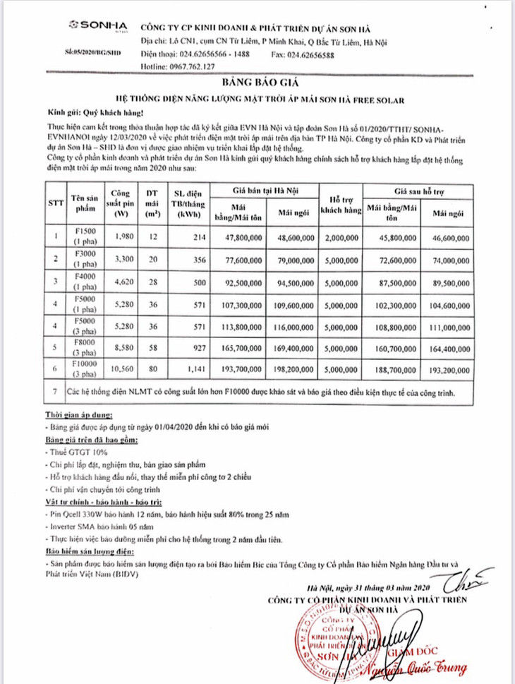 Để tạo điều kiện thuận lợi cho người dân Thủ đô lắp đặt hệ thống điện mặt trời áp mái, tháng 3 năm 2020, EVNHANOI đã ký kết thỏa thuận hợp tác phát triển điện mặt trời mái nhà trên địa bàn TP Hà Nội giữa Tổng công ty và Công ty cổ phần quốc tế Sơn Hà (Tập đoàn Sơn Hà). Theo đó, khách hàng tại Hà Nội khi tham gia lắp đặt hệ thống điện mặt trời áp mái trong năm 2020 sẽ được hỗ trợ tiền mặt 2 triệu đồng cho hệ thống có công suất dưới 3KWp và 5 triệu đồng cho hệ thống có công suất từ 3KWp trở lên, thực hiện công việc thủ tục liên quan đến thay thế công tơ điện 2 chiều và cung cấp dịch vụ bảo trì miễn phí cho hệ thống trong 2 năm đầu.