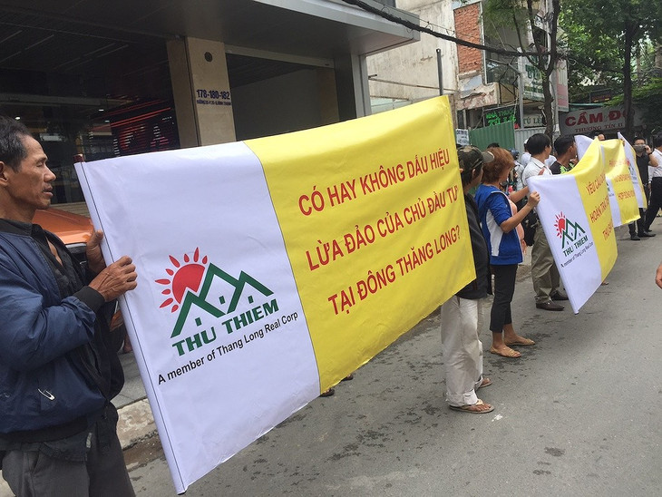 Ngày 18/8, hàng chục khách hàng mua nhà tại dự án Khu đô thị (KĐT) Đông Tăng Long (phường Trường Thạnh, Quận 9, TP.HCM) đã kéo đến địa chỉ liên hệ của chủ đầu tư là Công ty cổ phần phát triển Nhà Thủ Thiêm (Công ty Nhà Thủ Thiêm) trên đường D2, Phường 25, quận Bình Thạnh căng băng rôn phản đối.