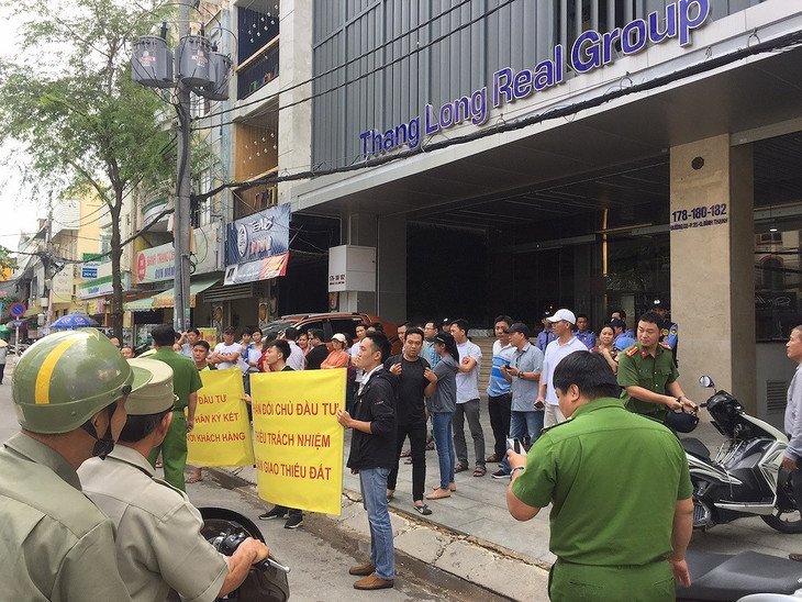 Nhận thấy chủ đầu tư có dấu hiệu “bỏ trốn”,ngày 18/8 hàng chục khách hàng đã kéo đến văn phòng Công ty Nhà Thủ Thiêm căng băng rôn, yêu cầu lãnh đạo công ty đối thoại.