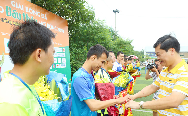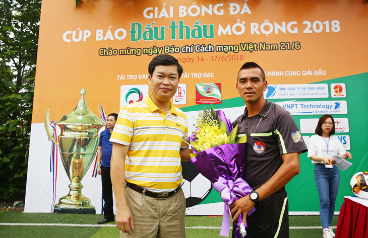 Tổng biên tập Báo Đấu thầu Đỗ Xuân Khánh tặng cờ lưu niệm và hoa chúc mừng các đội tham dự giải. Ảnh: Tường Lâm