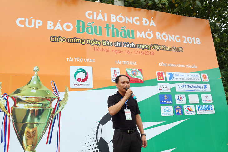 Phó Tổng biên tập Báo Đấu thầu, Trưởng ban tổ chức “Giải bóng đá Cúp Báo Đấu thầu mở rộng năm 2018”, Phạm Ngọc Thanh tuyên bố khai mạc. Ảnh: Tường Lâm