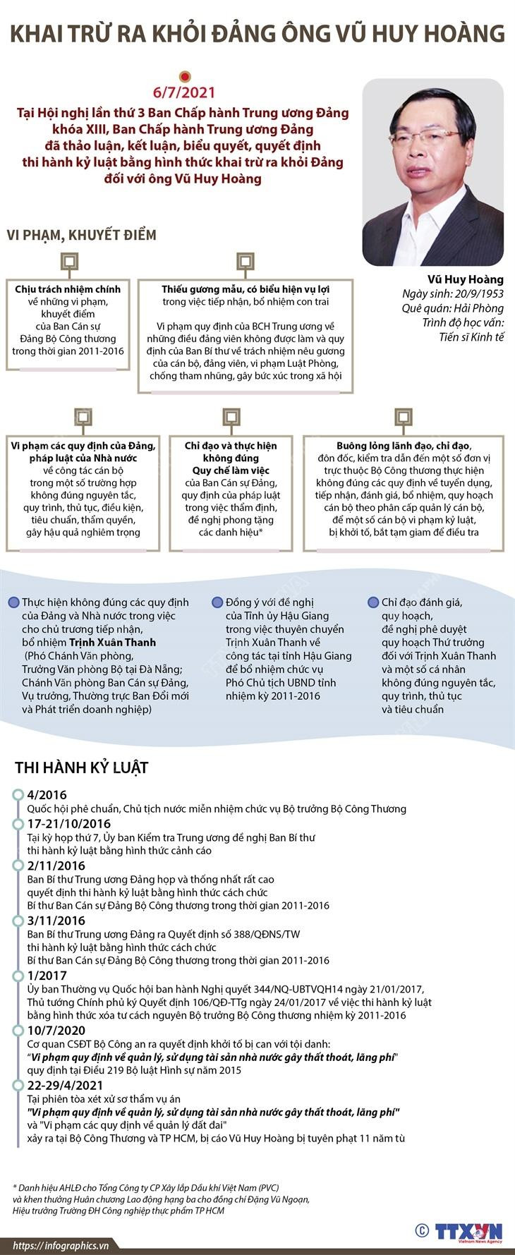 Ngày 6/7/2021, tại Hội nghị lần thứ 3, Ban Chấp hành Trung ương Đảng khóa XIII đã thảo luận, kết luận, biểu quyết, quyết định thi hành kỷ luật đồng chí Vũ Huy Hoàng, nguyên Ủy viên Trung ương Đảng bằng hình thức khai trừ ra khỏi Đảng.