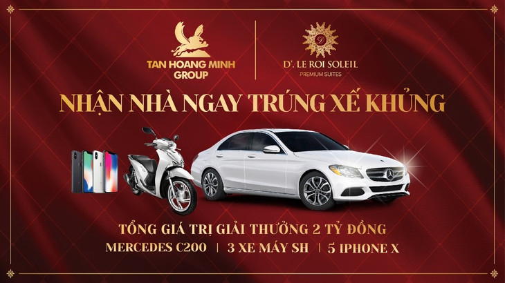 Với mong muốn mang đến cho khách hàng cuộc sống tiện nghi, đẳng cấp, chủ đầu tư Tân Hoàng Minh đã tung ra chương trình khuyến mại hấp dẫn mang tên “Nhận nhà ngay, trúng xế khủng với D’. Le Roi Soliel”. Theo đó, từ nay đến 2/12/2018, khách hàng mua căn hộ tại D’. Le Roi Soliel sẽ có cơ hội được tham gia bốc thăm trúng thưởng sở hữu 01 xe Mercedes C200 cùng với đó là 3 xe máy SH và 5 iPhone X. Tổng giá trị giải thưởng lên đến 2 tỷ đồng.