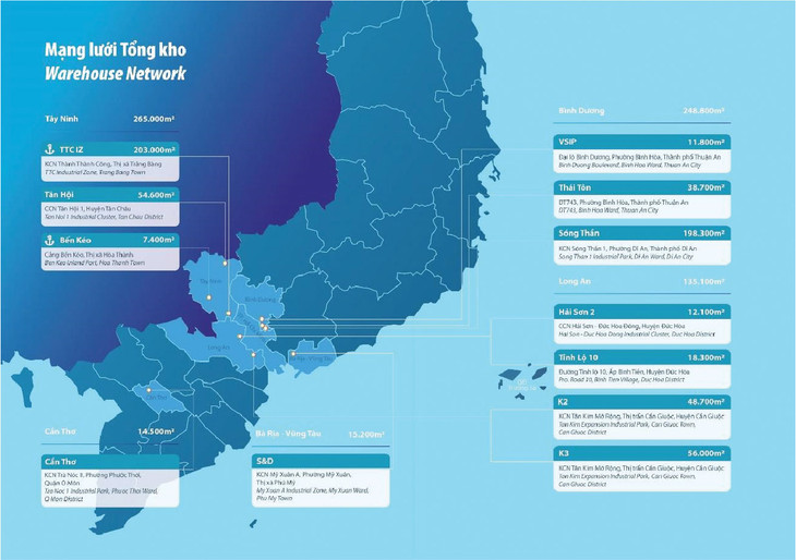 Với mạng lưới 690.000 m2 diện tích sàn kho xưởng tại Tây Ninh, Bình Dương, Long An, Cần Thơ, Bà Rịa - Vũng Tàu, TTC Đặng Huỳnh dự kiến sẽ mở rộng khu kho cảng vào năm 2025 thêm gần 38.076 m2 sàn và đặt mục tiêu đạt 1.000.000 m2 sàn vào giai đoạn 2026 - 2030, tập trung vào phân khúc kho xưởng cao cấp, đáp ứng tiêu chuẩn quốc tế. TTC Đặng Huỳnh trực tiếp quản lý và vận hành hệ thống kho xưởng chiến lược, chuyên cung cấp các giải pháp toàn diện giúp khách hàng tối ưu hóa hoạt động kho vận và giảm thiểu chi phí.
