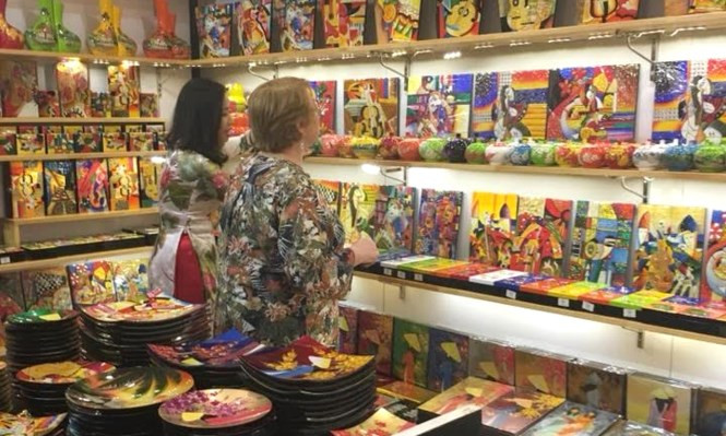 Tổng thống Chile Michelle Bachelet Jeria xem các sản phẩm lưu niệm của Việt Nam (nhạc cụ cổ truyền, tranh sơn mài, lụa...) trên phố Hàng Gai, Hà Nội.