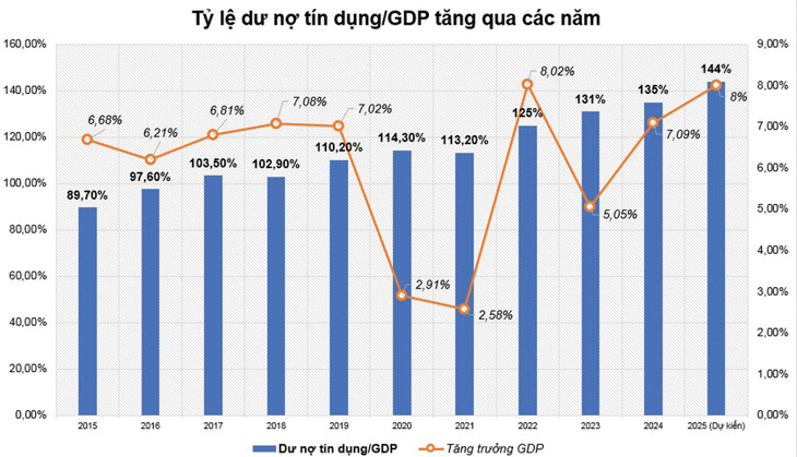 Ở góc nhìn tổng quan, TS. Lê Duy Bình, Giám đốc điều hành Economica Việt Nam bày tỏ lo ngại về tỷ lệ tín dụng/GDP đã ở mức cao trong những năm qua. Theo đó, năm 2022, khi dư nợ tín dụng của Việt Nam ở mức 125% GDP, Ngân hàng Thế giới đã đưa cảnh báo và đề xuất thận trọng với ngưỡng tín dụng ở mức này. Do đó, với mức tăng trưởng tín dụng 16%, dự kiến số vốn đổ ra nền kinh tế khoảng 2,5 triệu tỷ đồng, với mức tăng GDP 8% thì tỷ lệ tín dụng/GDP của Việt Nam sẽ ở mức trên 140%.
