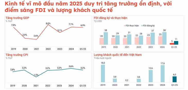 Báo cáo thống kê quý I/2025 cho thấy nền kinh tế Việt Nam tiếp tục khởi sắc với GDP tăng trưởng 6,9% và chỉ số CPI được kiểm soát ở mức 3,2%. Đặc biệt, vốn đầu tư trực tiếp nước ngoài (FDI) ghi nhận bước tiến ấn tượng, đạt 11 tỷ USD vốn đăng ký – tăng 34,7% so với cùng kỳ năm trước. Trong đó, khoảng 5 tỷ USD đã được giải ngân, phản ánh rõ xu hướng dịch chuyển sản xuất toàn cầu vào Việt Nam, nhất là trong các ngành công nghệ cao, điện tử và logistics.