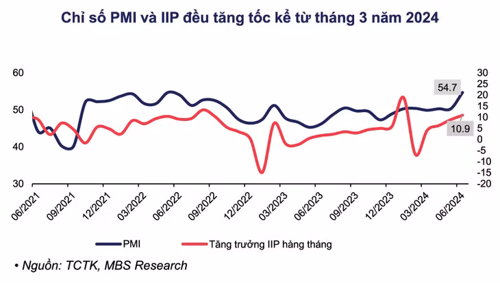 Với các doanh nghiệp, điểm thuận lợi là chỉ số nhà quản trị mua hàng (PMI) liên tục cải thiện, tăng mạnh lên mức 54,7 điểm vào tháng 6/2024. Đơn đặt hàng mới đã tăng trở lại với tốc độ tăng trưởng nhanh nhất kể từ tháng 3/2011. Từ kết quả trong quý II/2024, MBS nâng dự báo GDP năm 2024 lên 6,5% từ mức 6,3% trước đó với kỳ vọng nền kinh tế sẽ tăng trưởng lần lượt 6,6% và 6,5% so với cuối kỳ trong quý III và quý IV, nhờ xuất khẩu phục hồi, tiêu dùng nội địa cải thiện và giải ngân đầu tư công hiệu quả hơn. MBS dự báo xuất khẩu sẽ tăng 11% - 12% trong năm 2024, dẫn đến thặng dư thương mại đạt mức khoảng 12 - 14 tỷ USD.
