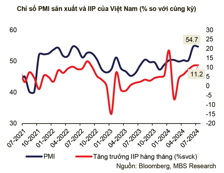Ghi nhận nhiều điểm sáng về tình hình sản xuất công nghiệp trong 7 tháng đầu năm, Thứ trưởng Bộ Công thương Phan Thị Thắng cho biết, chỉ số nhà quản trị mua hàng (PMI) tháng 7/2024 ngành sản xuất đạt 54,7 điểm, tăng 4 tháng liên tục và là mức cao nhất kể từ tháng 11/2018. Chỉ số sản xuất công nghiệp (IIP) sau 7 tháng tăng 8,5% so với cùng kỳ năm trước, là mức lũy kế cao nhất kể từ tháng 2/2024 đến nay.