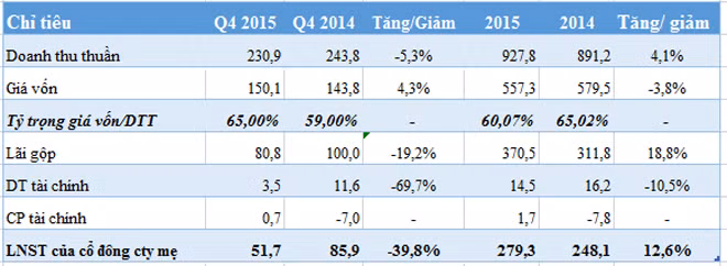 Doanh thu thuần quý 4 của công ty đạt 231 tỷ đồng, giảm hơn 10 tỷ đồng so với cùng kỳ. Tỷ trọng giá vốn/doanh thu thuần tăng khiến công ty lãi gộp 80,8 tỷ đồng, giảm 19,2% so với quý 4/2014.
