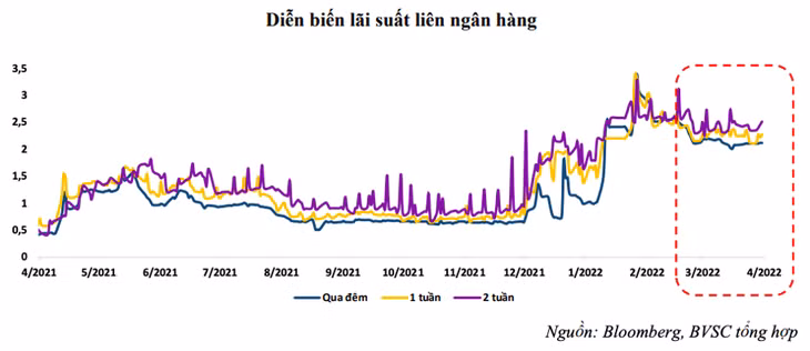 Sự hồi phục này cũng kéo theo nhu cầu về vốn cao hơn, làm căng thẳng thanh khoản hệ thống ngân hàng trong thời gian đó, khiến mặt bằng lãi suất liên ngân hàng cao hơn giai đoạn 2 năm 2020-2021. Điển hình, kỳ hạn qua đêm luôn trên 2%/năm, trong khi trước đó chỉ vào khoảng hơn 1%/năm.