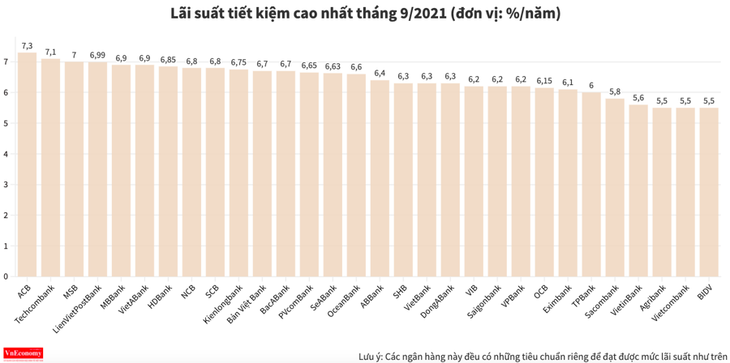 Về bảng xếp hạng mức lãi suất tiết kiệm cao nhất trong tháng 9/2021, dù ngân hàng ACB đã hạ 0,1 điểm phần trăm từ 7,4%/năm xuống còn 7,3%/năm nhưng vẫn tiếp tục dẫn đầu bảng xếp hạng. Đây là mức lãi suất được ngân hàng này áp dụng cho khoản tiết kiệm từ 30 tỷ đồng trở lên tại kỳ hạn 13 tháng.