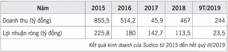Lũy kế 9 tháng đầu năm 2019, Sudico đạt hơn 244 tỷ đồng doanh thu và 23,5 tỷ đồng lợi nhuận sau thuế, cao gấp 2 lần về doanh thu nhưng giảm 68% về lợi nhuận so với cùng kỳ 2018. Đây cũng là mức lợi nhuận ròng 9 tháng thấp nhất của Sudico trong vòng 5 năm trở lại đây.