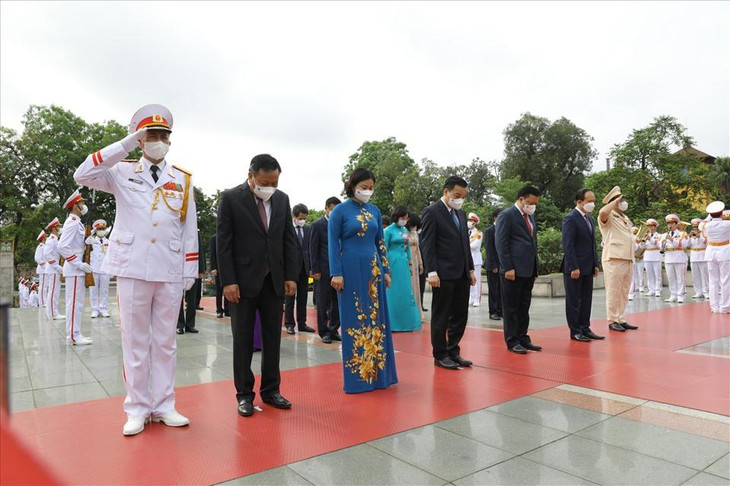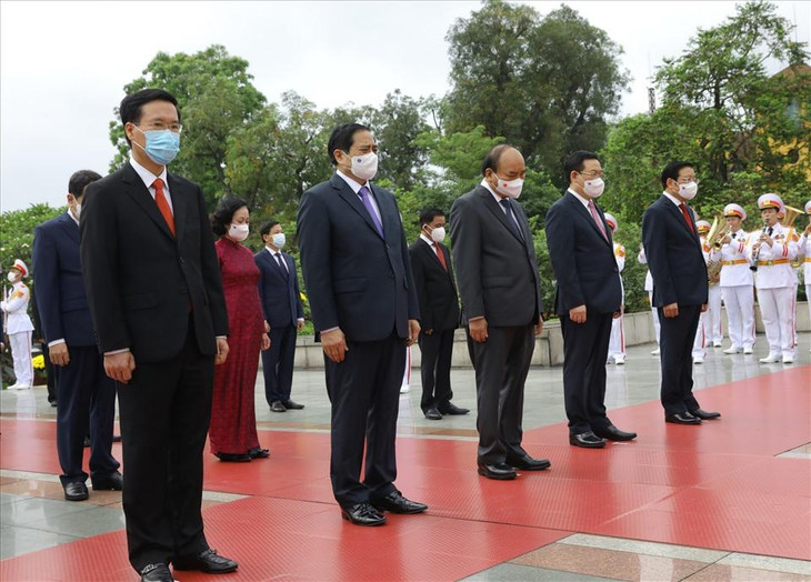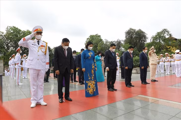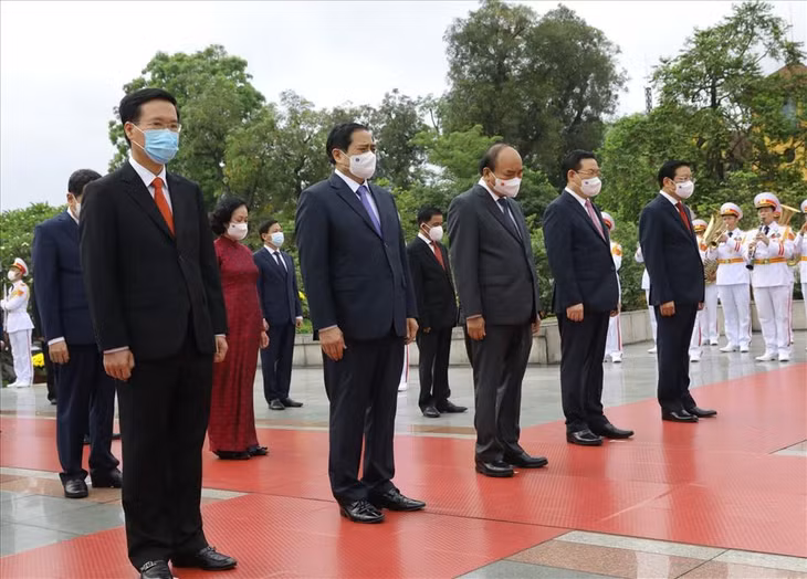 | Trước anh linh Chủ tịch Hồ Chí Minh, các lãnh đạo Đảng, Nhà nước thành kính bày tỏ lòng biết ơn vô hạn với công lao của Người đối với sự nghiệp cách mạng vẻ vang của Đảng và dân tộc ta. |