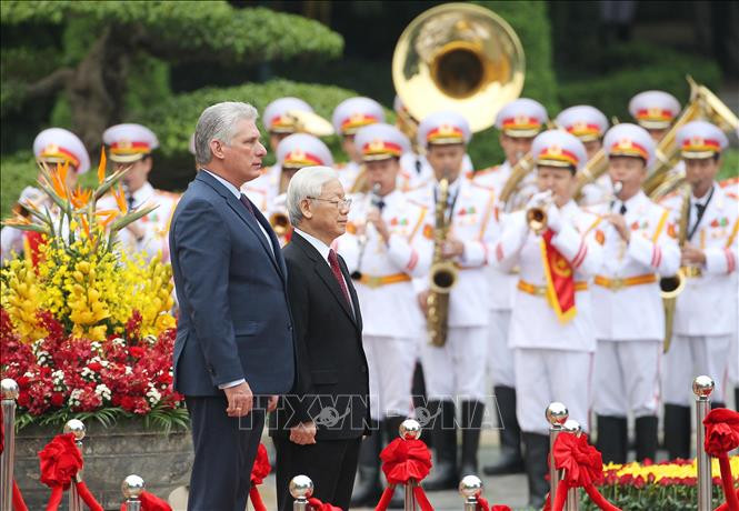 Tổng Bí thư, Chủ tịch nước Nguyễn Phú Trọng và Chủ tịch HĐNN và HĐBT Cuba Miguel Mario Díaz-Canel Bermúdez duyệt Đội danh dự Quân đội nhân dân Việt Nam. Ảnh: TTXVN