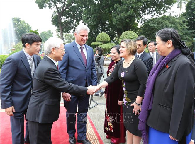 Tổng Bí thư, Chủ tịch nước Nguyễn Phú Trọng và Phu nhân đón Chủ tịch HĐNN và HĐBT Cuba Miguel Mario-Diáz Canel Bermúdez và Phu nhân. Ảnh: TTXVN