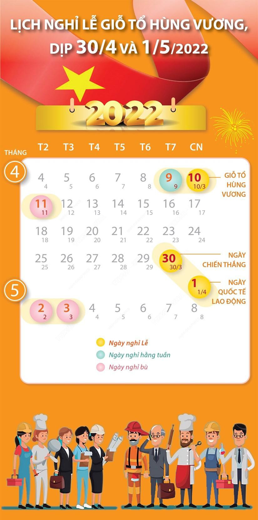 Năm nay, do các ngày nghỉ lễ Giỗ Tổ Hùng Vương, Chiến thắng 30/4, Ngày Quốc tế Lao động (1/5) đều trùng vào ngày nghỉ hằng tuần nên người lao động sẽ được nghỉ bù./.