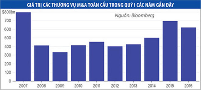 Hoạt động M&A toàn cầu trong quý I/2016 giảm 11% so với cùng kỳ năm ngoái, xuống còn 621,6 tỷ USD, theo số liệu của Bloomberg. Trong số đó, có 2 thương vụ nổi trội nhất là China National Chemical Corp đề nghị mua lại Syngenta AG với giá 43 tỷ USD và Shire Plc sáp nhập Baxalta Inc với giá 32 tỷ USD.
