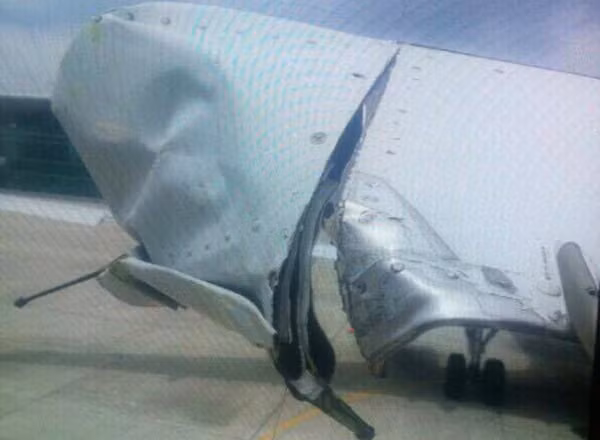 Hư hỏng tại cánh đuôi máy bay Vietnam Airlines. Ảnh: Xuân Hoa