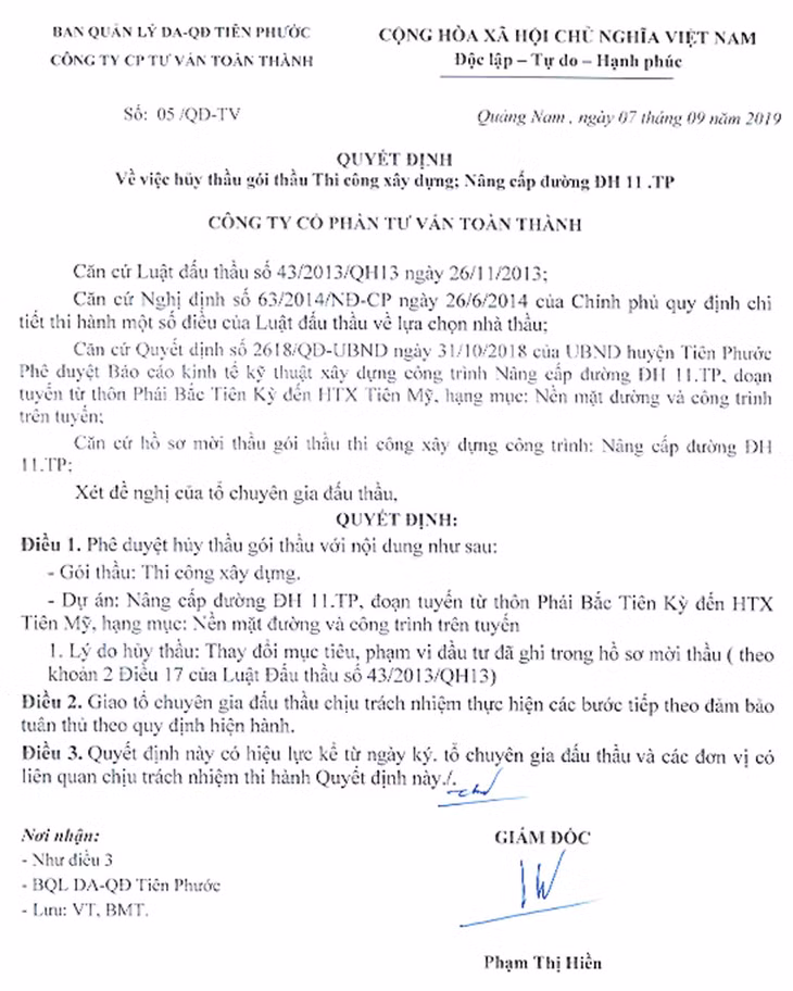 Điều đáng lưu ý, vào lúc 7h30 ngày 9/9/2019 - đúng thời điểm đóng/mở thầu Gói thầu Xây dựng thuộc Dự án Công trình kiên cố hóa tuyến ĐH 1.TP (gói thầu này sử dụng vốn ngân sách nhà nước, có giá khoảng 4,5 tỷ đồng), Công ty CP Tư vấn Toàn Thành đã tiến hành hủy thầu gói thầu này với lý do thay đổi mục tiêu, phạm vi đầu tư đã ghi trong HSMT. Gói thầu này cũng do Ban QLDA quỹ đất huyện Tiên Phước làm chủ đầu tư. Văn bản đính kèm quyết định hủy thầu này do Công ty CP Tư vấn Toàn Thành ban hành và công bố lại có nội dung hủy thầu Gói thầu Thi công xây dựng thuộc Dự án Nâng cấp đường ĐH 11.TP có giá 6,822 tỷ đồng (2 dự án khác nhau và 2 gói thầu có quy mô và nội dung thực hiện khác nhau).