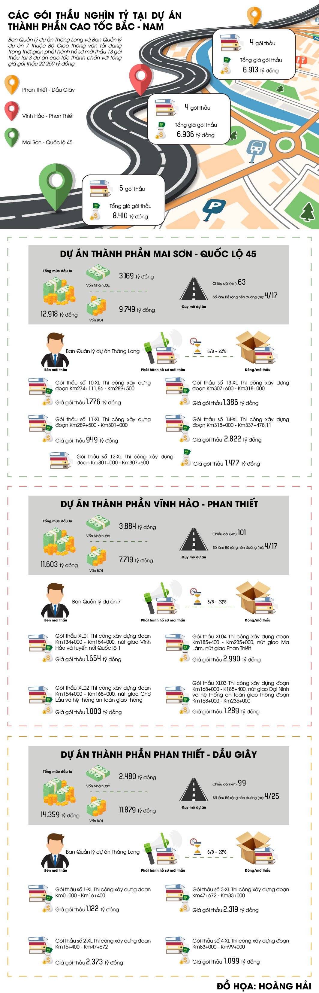 (BĐT) - Ban QLDA Thăng Long và Ban QLDA 7 thuộc Bộ GTVT đang trong thời gian phát hành HSMT 13 gói thầu tại 3 dự án cao tốc thành phần Phan Thiết - Dầu Giây, Mai Sơn - Quốc lộ 45 và Vĩnh Hảo - Phan Thiết.