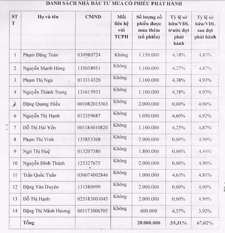 Đây là thương vụ chào bán cổ phần cho nhà đầu tư chiến lược, theo mô tả của Công ty là có năng lực tài chính mạnh, hỗ trợ được cho Công ty về vốn cũng như lĩnh vực quản lý điều hành. Danh tính 14 nhà đầu tư nhận chuyển nhượng 20 triệu cổ phiếu đã có ngay trong Nghị quyết của HĐQT thông qua phương án chào bán cổ phiếu riêng lẻ và đều là các thể nhân.