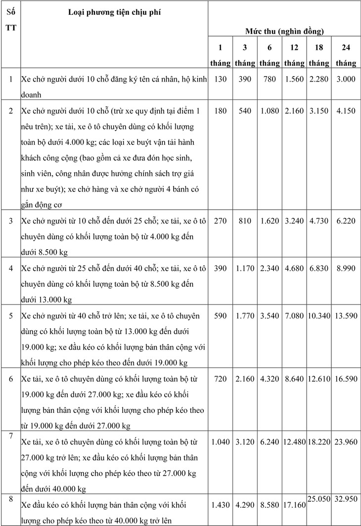Mức thu phí sử dụng đường bộ được quy định cụ thể như sau: