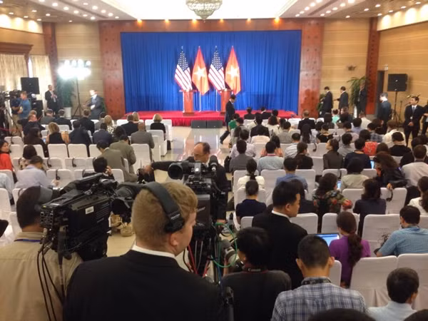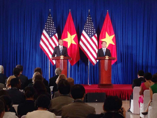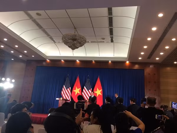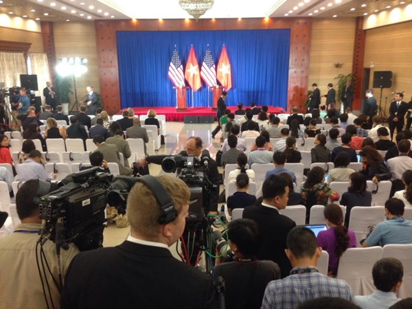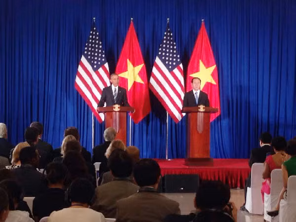 Chủ tịch nước Trần Đại Quang tổ chức họp báo chung với Tổng thống Mỹ Barack Obama tại Trung tâm Hội nghị Quốc tế, Hà Nội, vào trưa nay.
