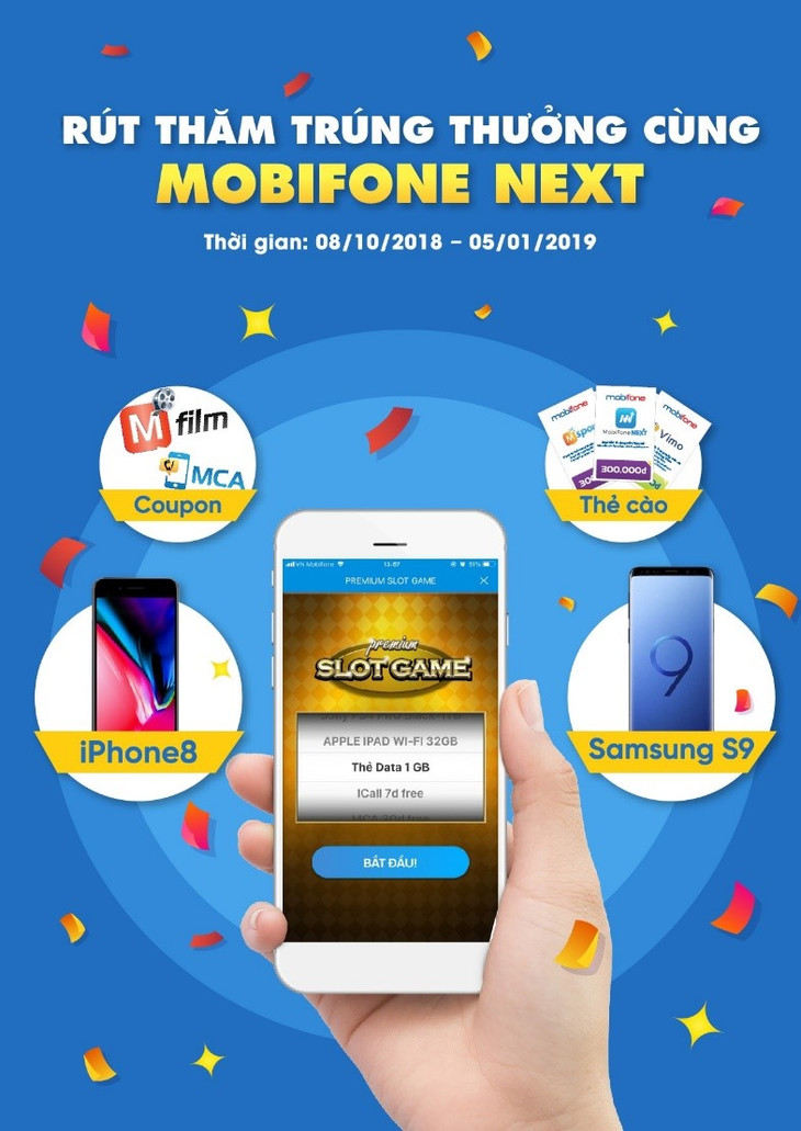 Từ nay đến ngày 5/1/2019, MobiFone triển khai chương trình khuyến mại Rút thăm may mắn trên ứng dụng MobiFone NEXT. Cụ thể, sau mỗi lần thực hiện giao dịch nạp tiền thành công trên MobiFone NEXT, khách hàng sẽ có cơ hội tham gia rút thẻ may mắn để nhận phần thưởng là các dòng smartphone mới nhất hiện nay hoặc các thẻ cào/ dịch vụ của MobiFone.
