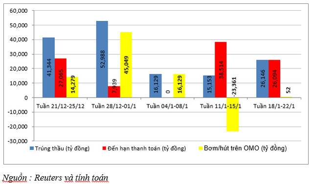 Số liệu thống kê trên thị trường mở (OMO) ghi nhận tổng khối lượng trúng thầu trong tuần 18-22/1 là 26.146 tỷ đồng, trong khi đó, khối lượng đáo hạn là 26.094 tỷ đồng. Như vậy, NHNN đã bơm ròng 52 tỷ đồng trên OMO, trong tuần, NHNN chủ yếu phát hành đối với kỳ hạn 42 ngày, lãi suất phát hành tiếp tục duy trì ở mức 5%/năm.